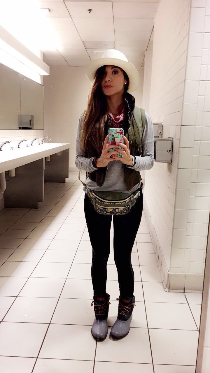 El día de mi viaje tuve la ventaja que mi vuelo salía de noche, lo cual al menos me dio tiempo para alistarme con un poco más de tranquilidad. Recuerdo haber dejado apartada la ropa que me pondría ese día: leggings negros, camiseta manga larga de tela suave y ligera color gris, chaleco verde olivo, una bandana rojo lavado y mis botas favoritas de Sperry que me sirvieron muchísimo en los días lluviosos y lodosos durante mi voluntariado. Todo lo que me puse ese día fue pensando en estar cómoda para dormir en el avión y a la vez verme bien cuando llegara a mi destino. El resto de lo que necesitaría llevar conmigo a mano en el avión – pasaporte, billetera, libro, cámaras, computadora, cosméticos, etc – también lo aparté y lo empaqué en mi equipaje de mano.